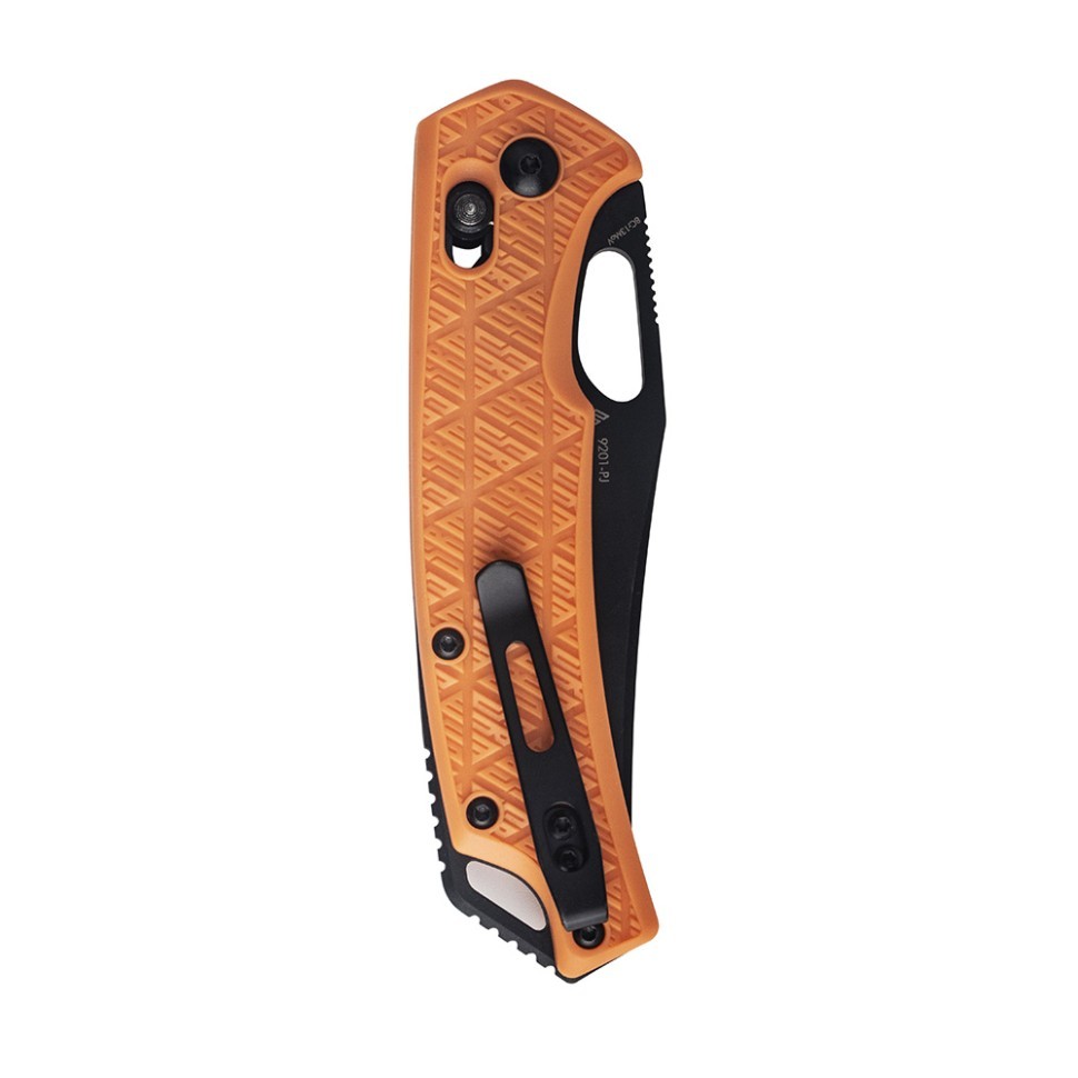 Рукоять выполнена из термостойкого и ударопрочного армированного нейлона, что делает нож особенно легким и при этом прочным. Благодаря рельефной текстуре нож удобно лежит в руке и не скользит даже при намокании. Стальной шарикоподшипник в осевом узле обеспечивает мягкое, плавное открытие клинка, а фиксирующий механизм надежен и прост в использовании.