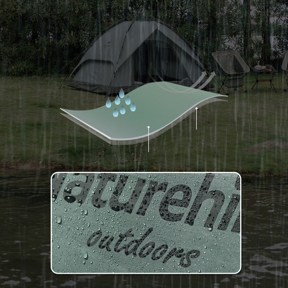 Материалы водонепроницаемой палатки Naturehike отличаются высоким качеством и долговечностью. Внутренняя часть и внешний тент изготовлены из прочной водонепроницаемой ткани Oxford 210D с полиуретановым покрытием, обеспечивающим уровень защиты до 2000 мм водяного столба. Это надежная защита от осадков и порывов ветра. Внешний тент можно использовать отдельно, например, в качестве навеса от солнца на кемпинге. Материалы устойчивы к износу и хорошо держат форму даже после многократного использования.
