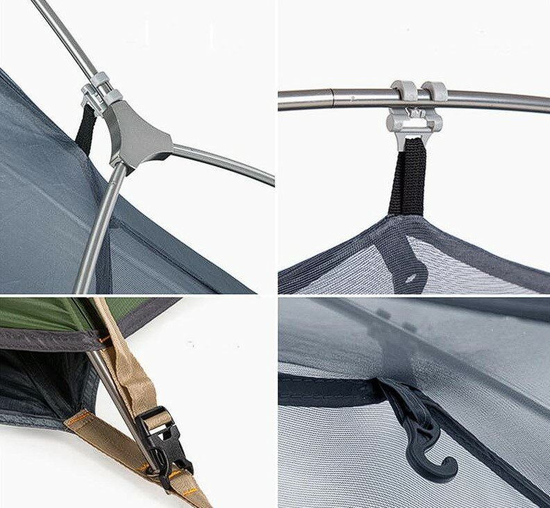 Палатка рассчитана на одного пользователя. Она имеет форму полусферы, комфортная, её легко установить. Подходит для разных видов активного отдыха. Эта палатка сделана из такого материала, как 210Т клетчатая нейлоновая ткань, степень водостойкости которой достигает более 3000 миллиметров водяного столба. Также в состав вошла ткань Оксфорд 150D со степенью водостойкости свыше 3 тысяч миллиметров водяного столба.