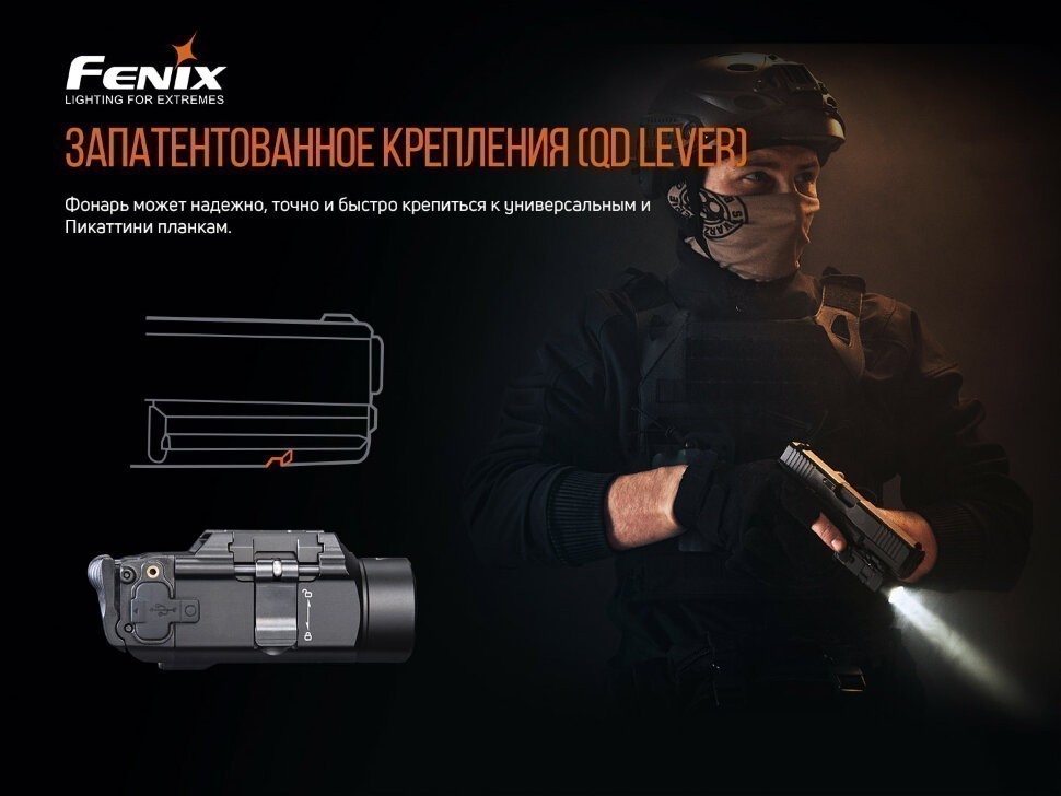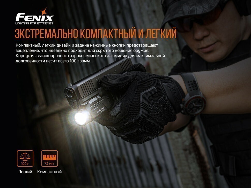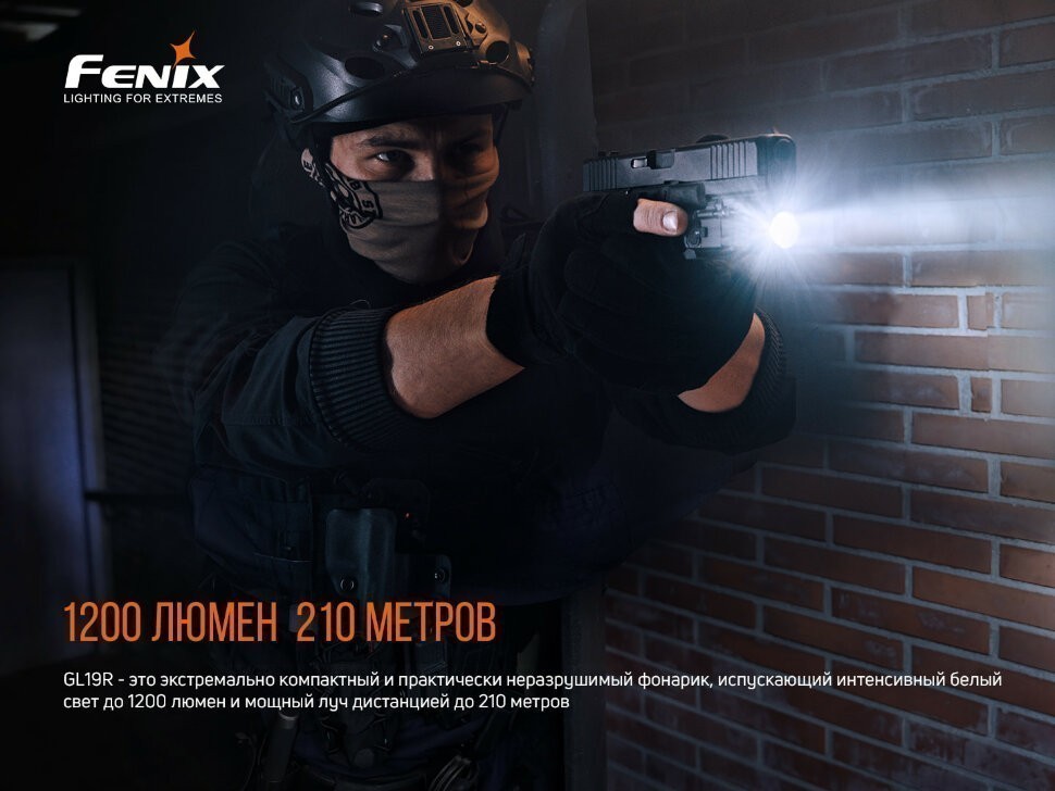 Модель Fenix GL19R представляет собой мощный аккумуляторный фонарь для тактических целей. Его разработали специально для того, чтобы улучшать видимость и возможности прицеливания при стрельбе. GL19R достаточно компактный по размерам и практически неразрушимый, обеспечивает интенсивное белое освещение яркостью 1200 люменов. Дистанция луча достигает 210 метров. Его можно быстро зафиксировать как на универсальной направляющей, так и на планке Пикатинни при помощи запатентованного рычага QD. Двусторонние задние кнопки обеспечивают моментальное управление одним пальцем кратковременного или постоянного включения. Режим стробоскопа можно запустить длительным нажатием при включенном свете, чтобы помочь вам контролировать ситуацию.