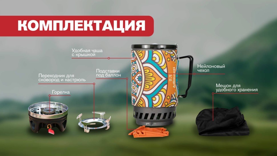 Система приготовления пищи, которая послужит вам в туристической деятельности и активном отдыхе. Включает в себя горшок, газовую плиту, держатель, подставку для газовых баллонов.