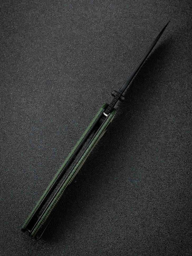 Рукоятка изготовлена из материала Микарта. Ручка из этого сырья на ощупь теплая и не скользит в руке. Также синтетический материал не впитывает посторонние запахи и не деформируется даже спустя долгое время использования. Клипса на рукояти закреплена с помощью болтика, который можно открутить, чтобы переставить клипсу на другую сторону.