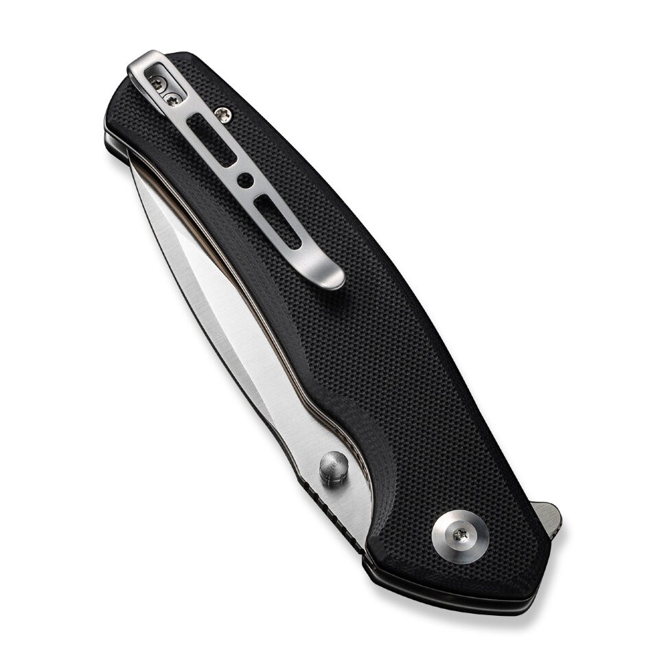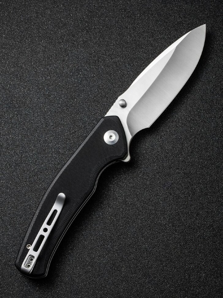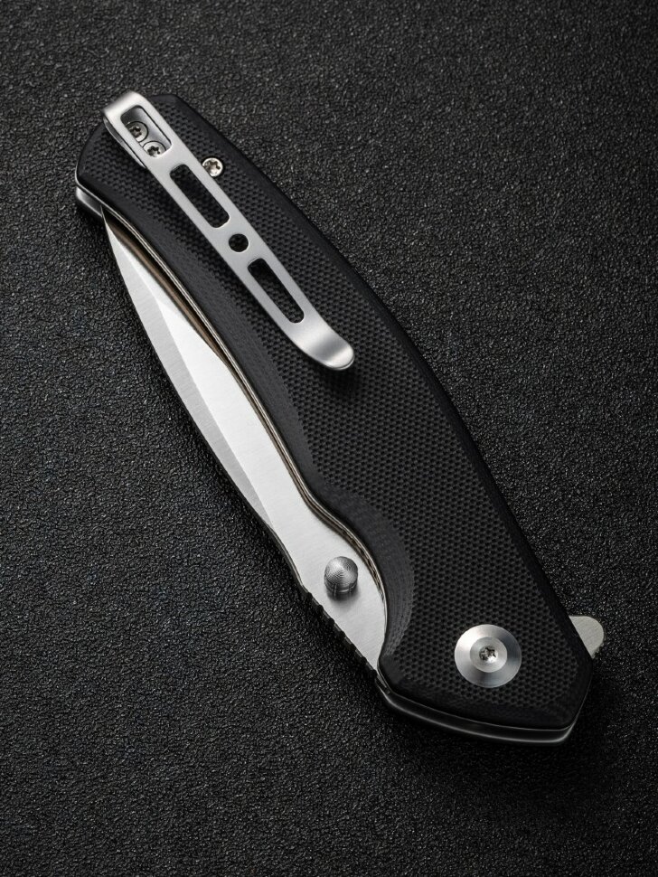 Черная рукоять изготовлена из стеклотекстолита G10. Композитное волокно сохраняет форму дольше чем натуральный материал и вдобавок не впитывает запахи. Если вы пользуетесь ножом для разделки рыбы или мяса, то это очень важный фактор. Также шероховатая структура материала добавляет рукоятке цепкость с кожей. Нож будет крепко лежать в руке, даже если ладонь сильно намокнет. Клипса на рукояти закреплена с помощью болтика, который можно открутить, чтобы переставить клипсу на другую сторону.