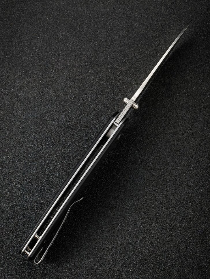 Раскрывается клинок двумя способами — указательным пальцем за шпенек и большим пальцем с помощью флиппера. Лезвие плотно сидит внутри рукоятки благодаря замку liner lock. Плавный ход ножу обеспечивает керамический подшипник. Механизм крепко удерживает лезвие, тем самым защищая владельца от случайного раскрытия внутри кармана. Также для безопасности на лезвие добавлена выемка под большой палец. Эта деталь продумана для того, чтобы палец лежал в углублении и не скользил по острию ножа.