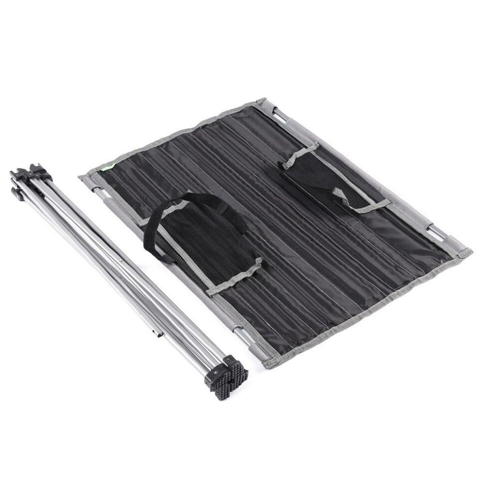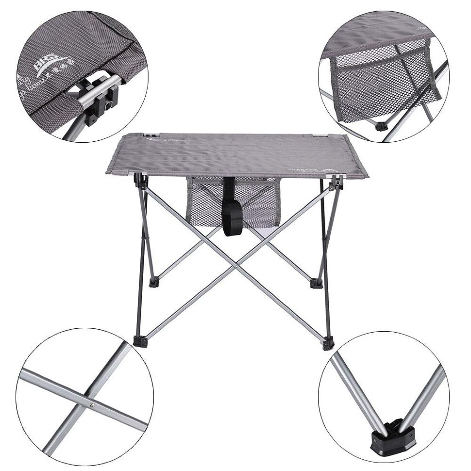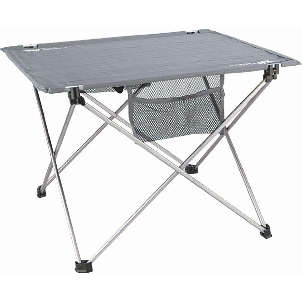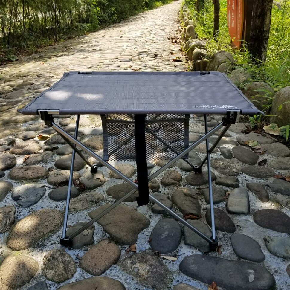 Столешница состоит из водонепроницаемой ткани по типу Оксфорд 1680 и алюминиевых досок. Алюминий износостойкий и не подвержен коррозии. Встроенные алюминиевые дощечки добавляют устойчивость столу, благодаря чему посуда не заваливается в разные стороны. В завернутом виде столешница выступает в форме чехла для ножек. Сбоку есть специальная липучка, с помощью которой скрепляется весь набор. Также стол продуман по специальному вогнутому внутрь дизайну, который защищает посуду от скольжения. Тканевая основа водонепроницаемая и отлично отмывается от пятен. Весит вся конструкция 0,7 килограмм.