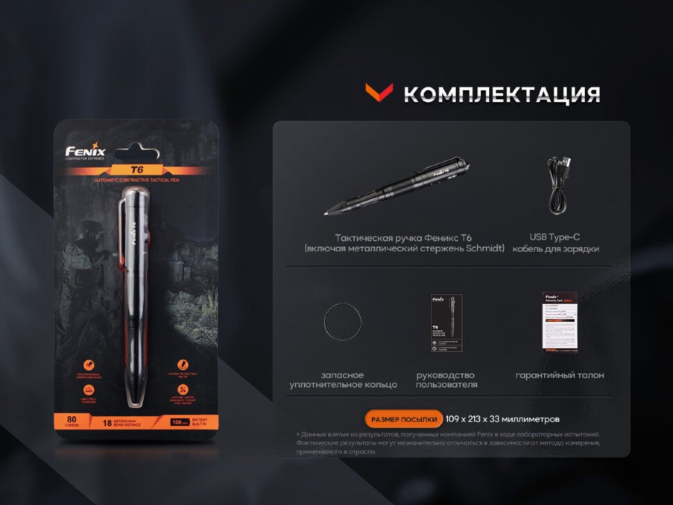 Комплектация: тактическая ручка Fenix T6 (вместе со стержнем); кабель для зарядки USB Type-C; запасное уплотнительное кольцо; инструкция к применению; талон гарантии.