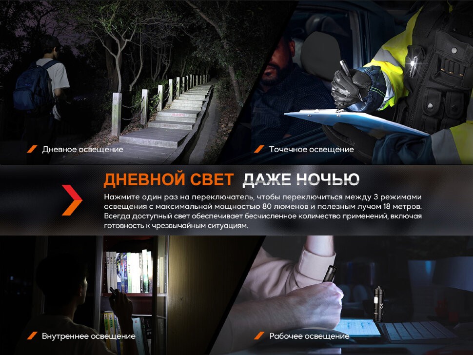 Средний режим: световой поток достигает 20 люменов, дальнобойность луча равна 12 метрам. Время свечения в данном режиме составляет два с половиной часа. Интенсивность освещения равна 22 канделам.