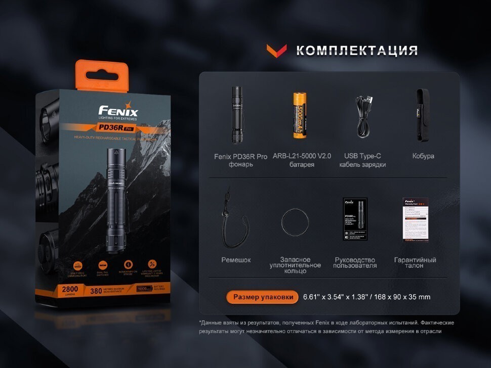 Комплектация: фонарь Fenix PD36R Pro, литий-ионный аккумулятор Fenix ARB-L21-5000 V2.0, кабель для зарядки USB Type-C, чехол, темляк, запасное уплотнительное кольцо, инструкция пользователя, талон гарантии.