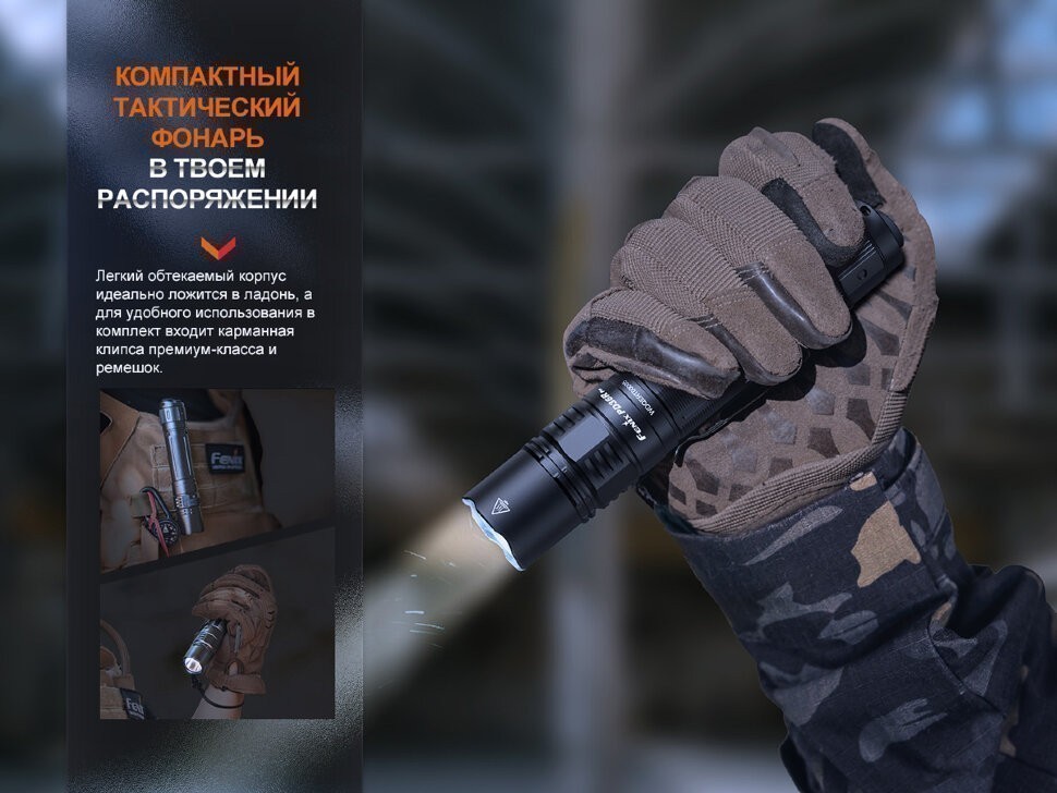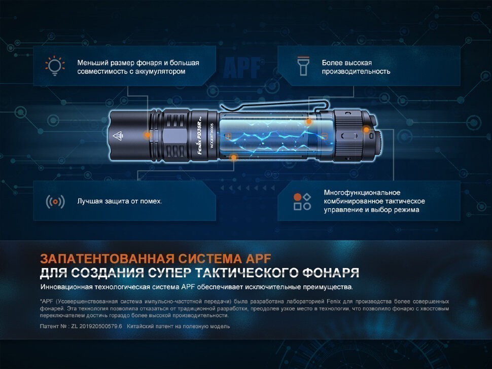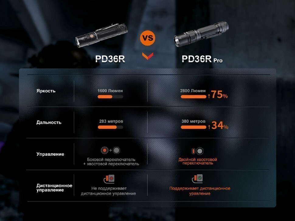 Фонарь модели Fenix PD36R Pro предназначается для тактических целей. Его можно использовать во время охотничьей деятельности. Эта модель даёт максимальную яркость света 2800 люменов при дальности луча 380 метров. Работает такой фонарь на диоде Luminus SFT70 со сроком службы 50 тысяч часов. Для питания используется батарея форм-фактора 21700 литий-ионная с ёмкостью 5000 мАч.