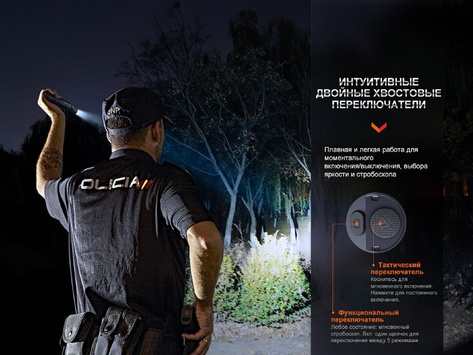 Моментальное включение фонаря происходит с помощью круглой хвостовой кнопки - это тактический переключатель. Овальная хвостовая кнопка является основным переключателем для моментального стробоскопа и выбора режима свечения. Чтобы выбрать режим яркости, необходимо при включённом состоянии фонаря нажать на овальный переключатель, и это позволит перемещаться между уровнями Турбо – Эко – Низкий – Средний – Высокий.