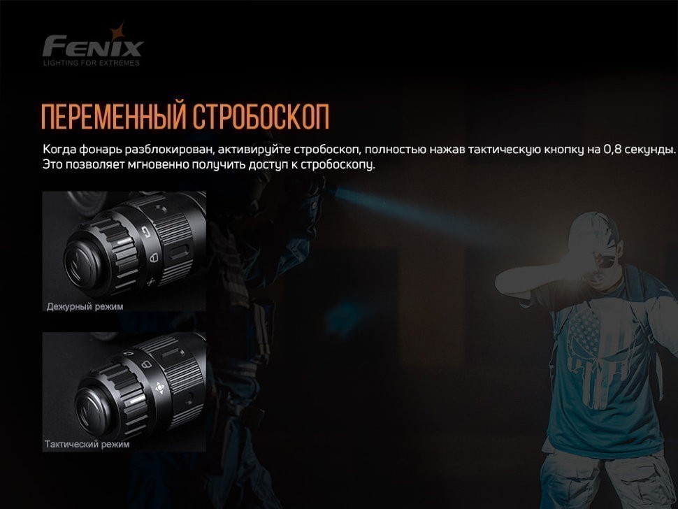 Для выбора режима среди Тактических: слегка надавите на тактическую кнопку в хвостовой части. Фонарь активируется моментально. Чтобы зафиксировать включение в Максимальном режиме, нужно до щелчка, полностью, надавить на кнопку. Для входа в режим Строб нажмите и подержите тактическую кнопку чуть менее секунды. Для возвращения в Максимальный режим нажмите кнопку снова, без щелчка. Полностью зажав хвостовой переключатель, вы сможете погасить свет.