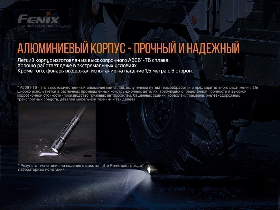 Размеры прибора составляют 140*34*23,5 миллиметра. Весит 114 грамм, не учитывая батарейки. Корпус у данного фонаря достаточно прочный, в основе – сплав алюминия А6061-Т6. Этот материал часто применяют в промышленности, поскольку он обладает привлекательными свойствами. Прочный, стойкий к износу и надёжный. Модель выдерживает падение с высоты одного метра, сохраняя целостность и работоспособность. Также может погружаться и под воду, и светит там так же хорошо, как и на суше. Стандарт защиты от пыли и влаги: IP68. Корпус обладает покрытием, сверхпрочным анодированием. Стойкость к абразивным воздействиям.