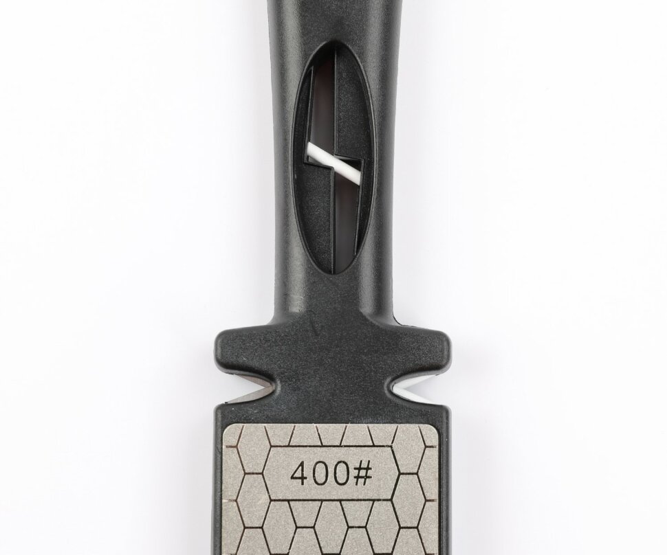 - С одной стороны находится пластина зернистостью 400 грит, предназначенная для грубой заточки лезвия с формированием необходимого угла;