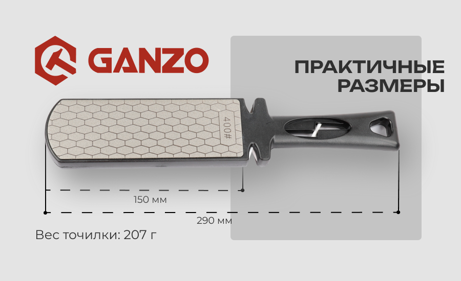 Полные размеры Ganzo ProSharp составляют 290 х 57 миллиметров, а толщина конструкции — 20 миллиметров. Вес точильного аксессуара не превышает 207 грамм. В хвосте рукоятки предусмотрено широкое сквозное отверстие. С его помощью можно подвесить точилку на кухонный держатель, чтобы модель всегда была под рукой в необходимый момент.