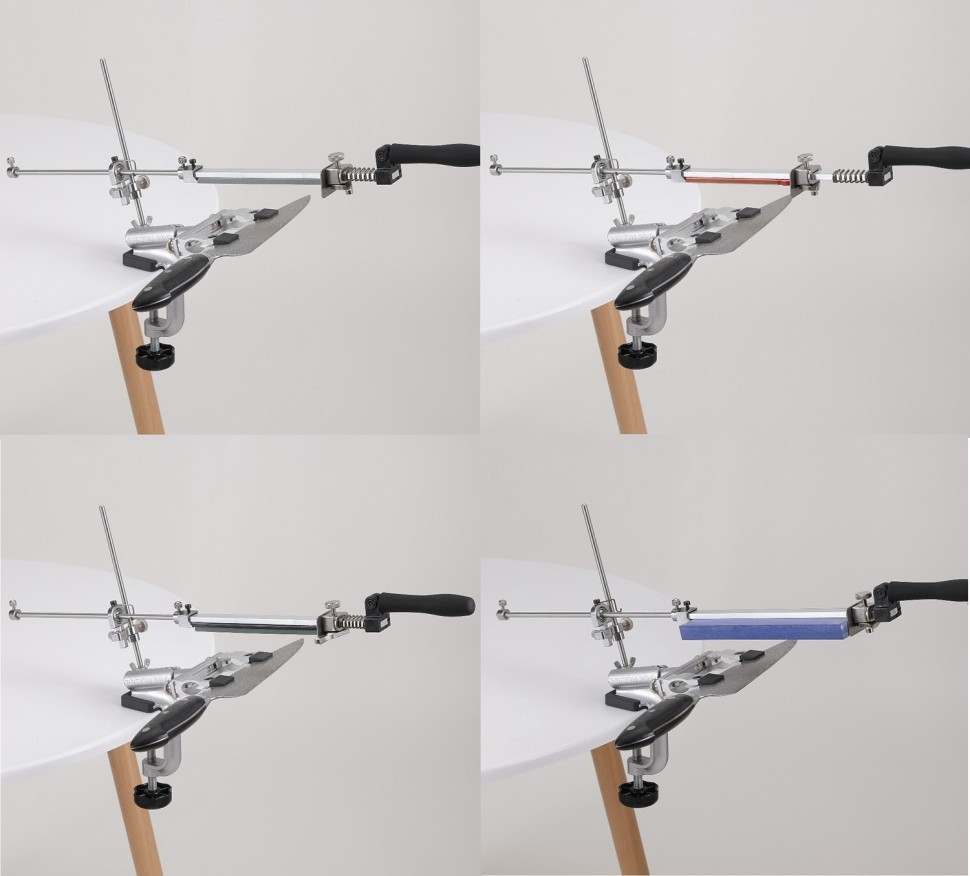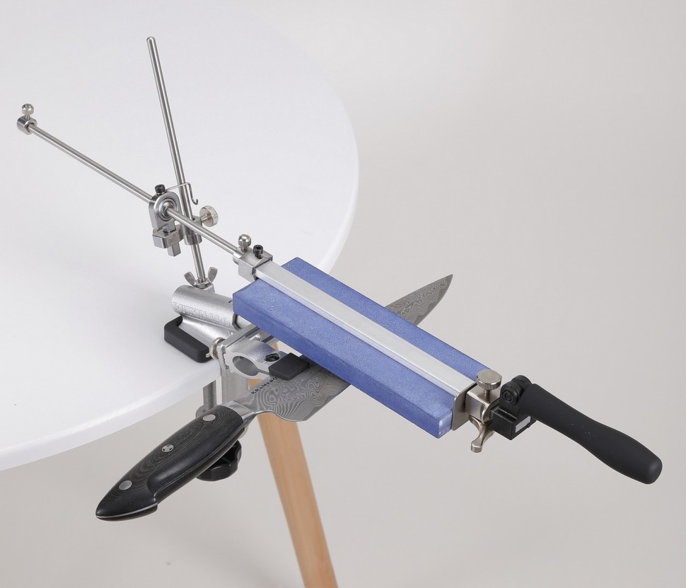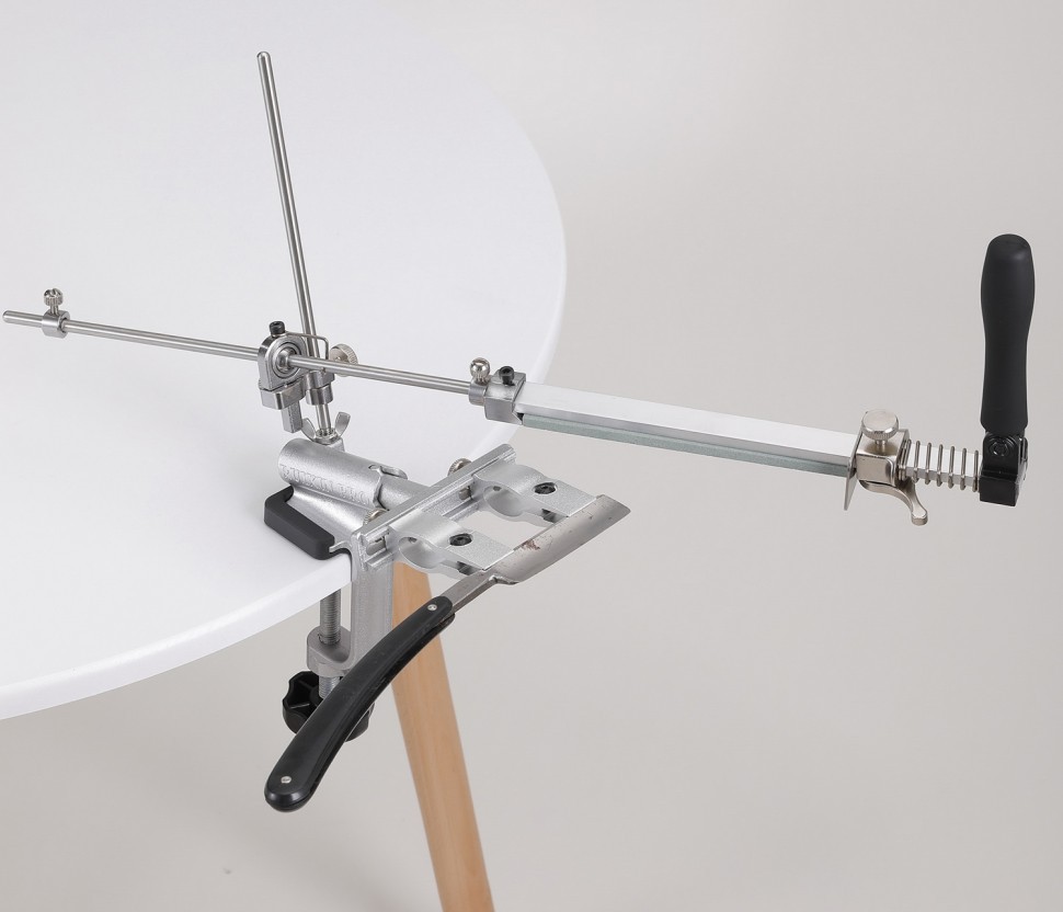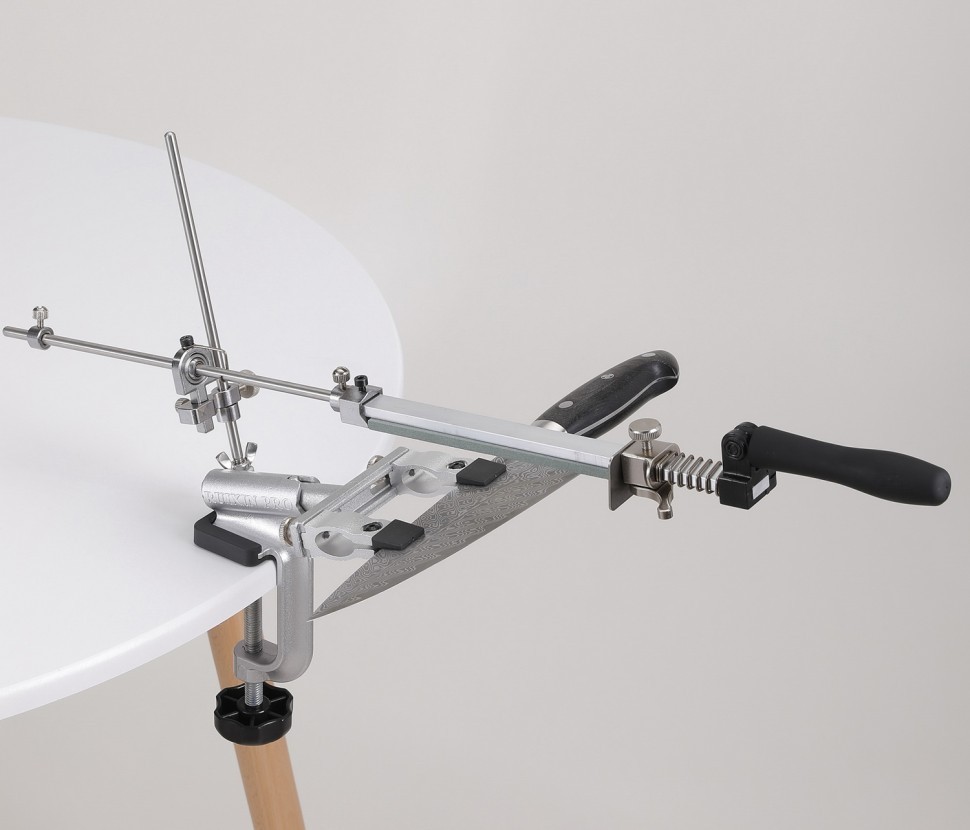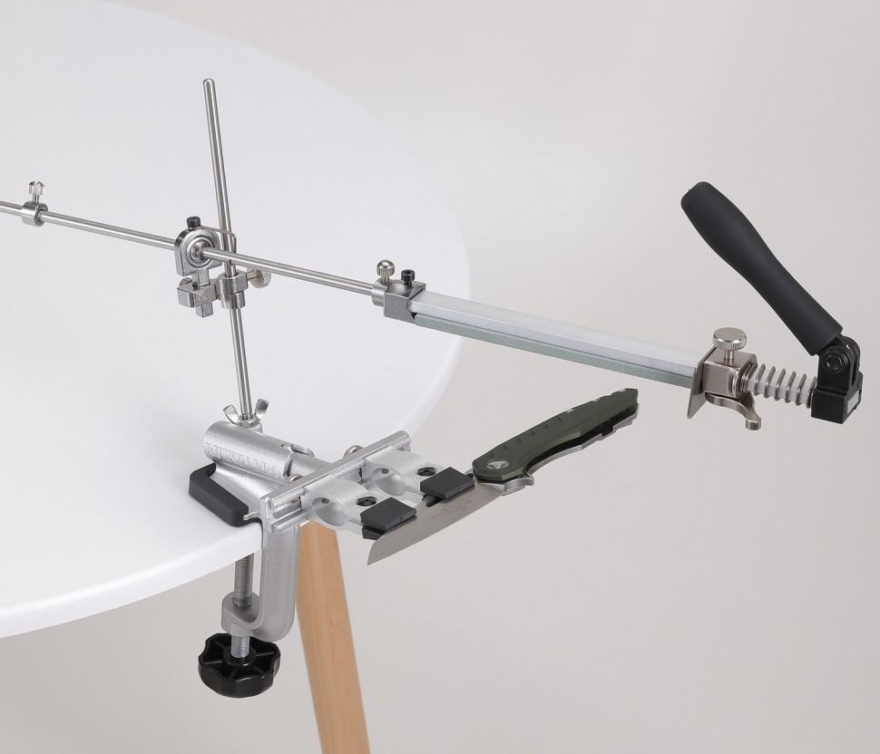 - быстрая фиксация, регулирование угла заточки и смена точильных камней;