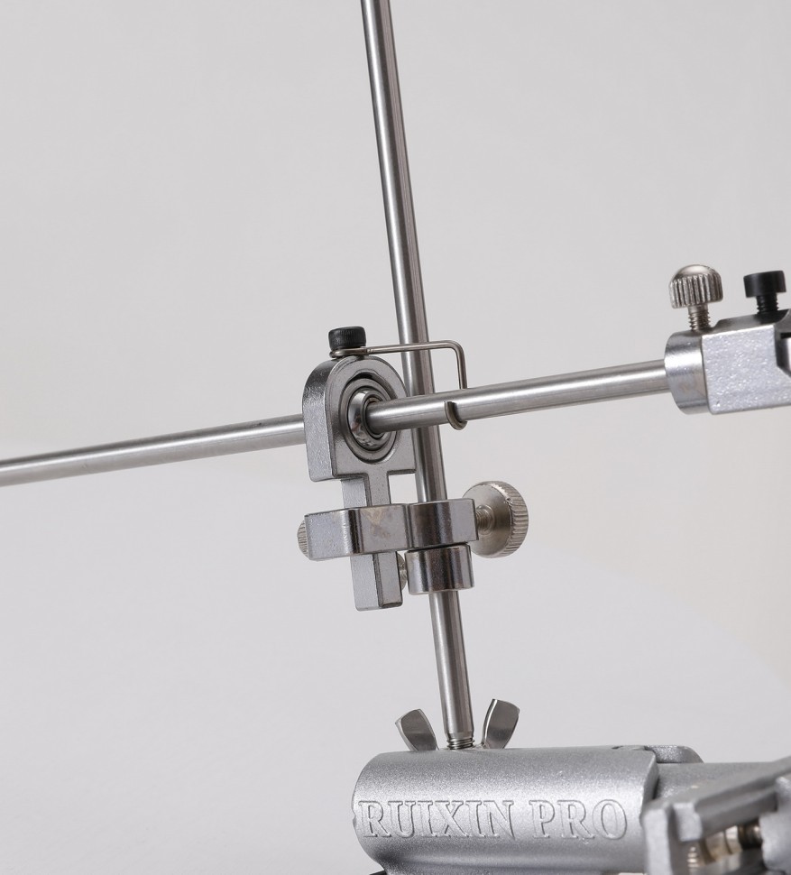Несущие детали станка Ruixin Pro RX-009 изготовлены из прочной нержавеющей стали. Крепления в виде болтов и запчасти для соединения балок между собой создают прочную конструкцию. Тиски для фиксации основания надежно удерживают станок в вертикальном положении. В комплекте предусмотрен ключ для сборки точилки и затяжки болтов во время работы. Если во время работы отпадает необходимость во втором тиске, его можно отодвинуть в сторону.