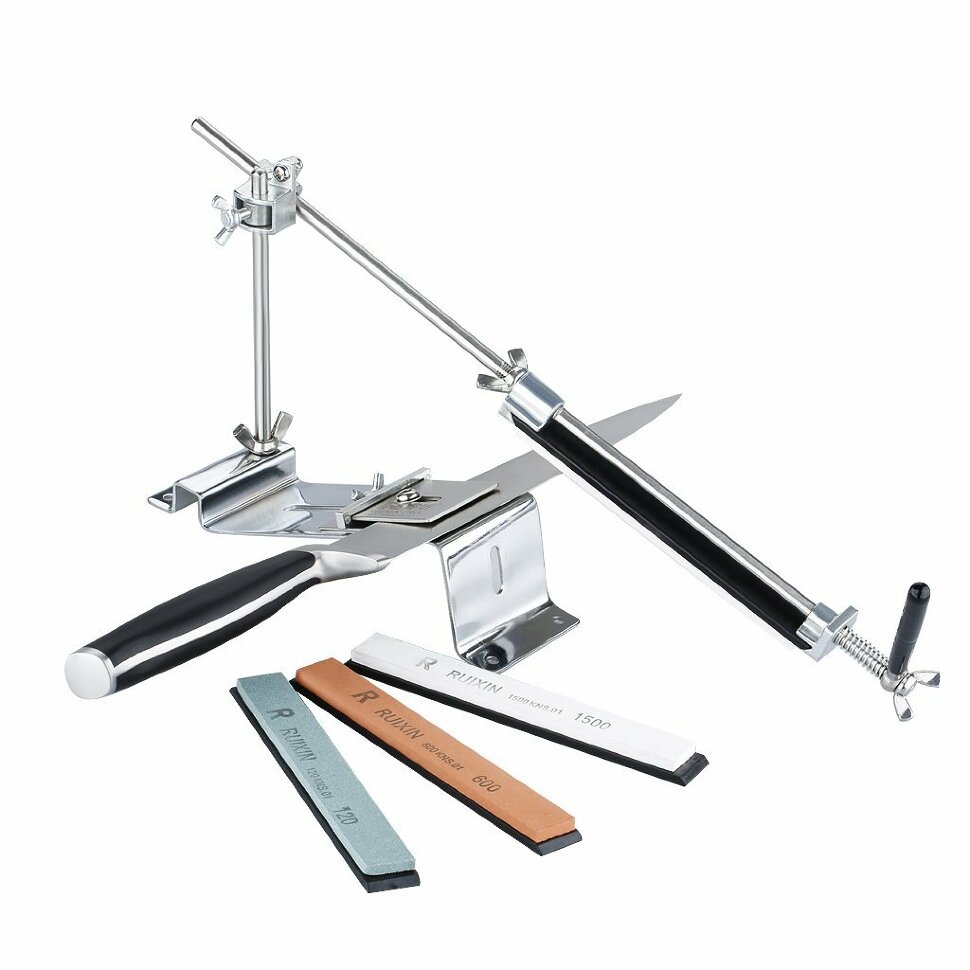 Модель Ruixin — это один из клонов на известную точилку Edge Pro. Она полностью выполнена из металла, хотя и не из нержавейки, а из никелированного железа. Основание точилки можно прикрутить к столешнице болтами или же просто поставить на стол и придерживать во время работы рукой. Точильный станок собирается из нескольких деталей, поэтому в разобранном виде он очень компактный и удобный для транспортировки. В комплект входит сразу четыре точильных камня, каждый из которых закреплен на пластиковой подложке. Из можно достаточно быстро закрепить на направляющей и поочередно менять для достижения наилучшего результата. Зернистость этих камней составляет 120, 320, 600 и 1500 грит. Производители рекомендуют затачивать лезвие плавными движениями «от себя», не надавливая на клинок до появления заусенца. Помимо ножей, с помощью Ruixin можно заточить ножницы, строительные или сельскохозяйственные инструменты, а также другие предметы, нуждающиеся в подобном уходе. Угол заточки каждый пользователь может выбрать самостоятельно, благодаря чему удается качественно заточить ножи разного назначения: толстые охотничьи, туристические или наиболее тонкие филейные. Весит точилка Ruixin 845 грамм.