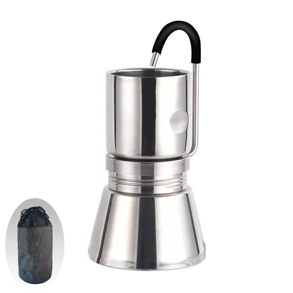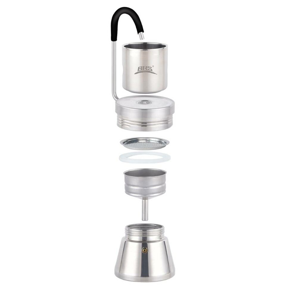 Корпус изготовлен из стали 304. Металл не поддается коррозии и не выпускает примеси при нагревании. Объем чаши для воды 450 миллилитров, что позволяет заварить кофе сразу на несколько кружек. Рассчитана кофеварка только на молотые зерна.