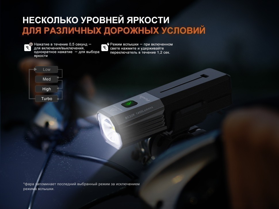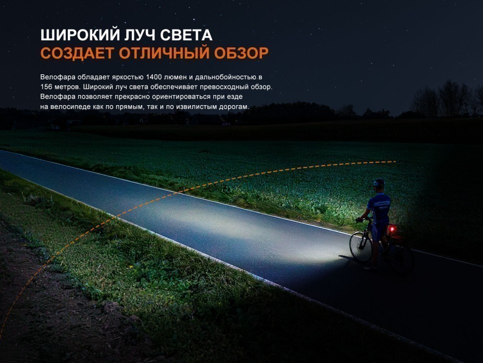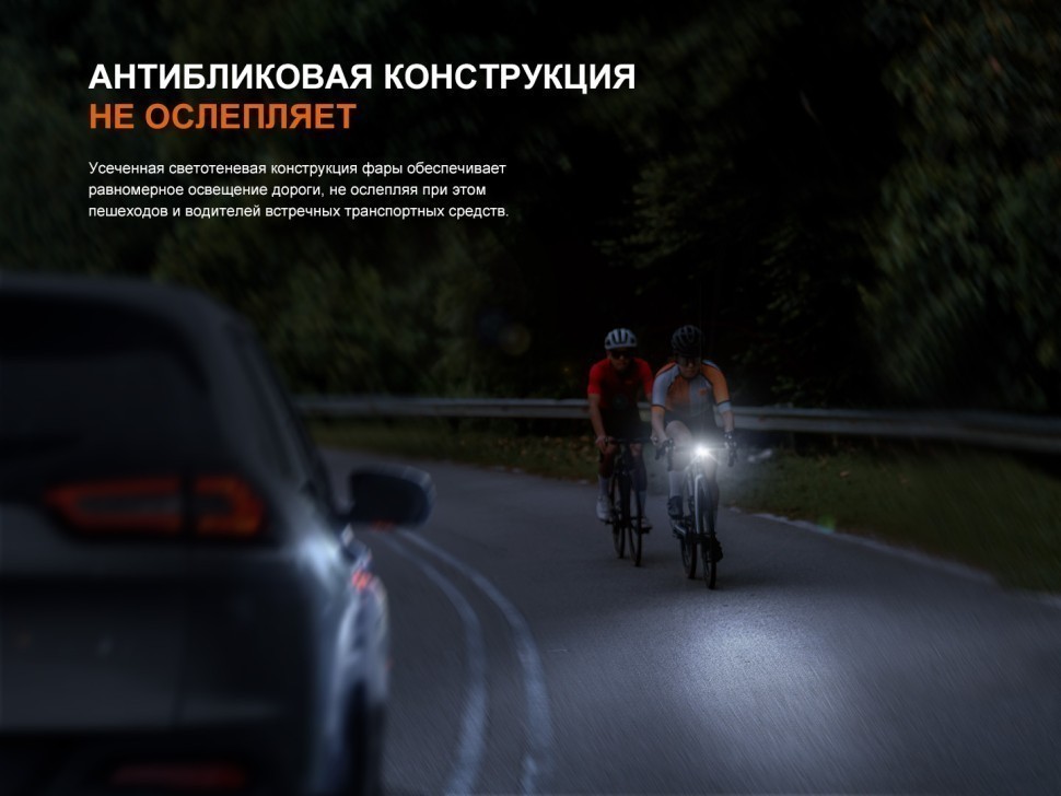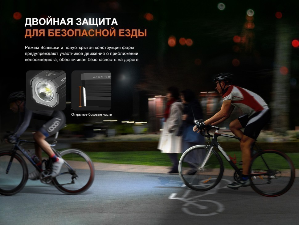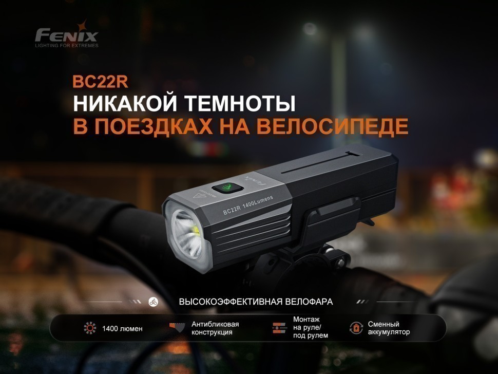Fenix BC22R — высокопроизводительный фонарь для любителей велоспорта. Отличительной особенностью велофары являются инновационная светотеневая конструкция с полуоткрытой линзой. Фонарь не ослепляет пешеходов, при этом предупреждая транспортные средства о приближении велосипедиста.