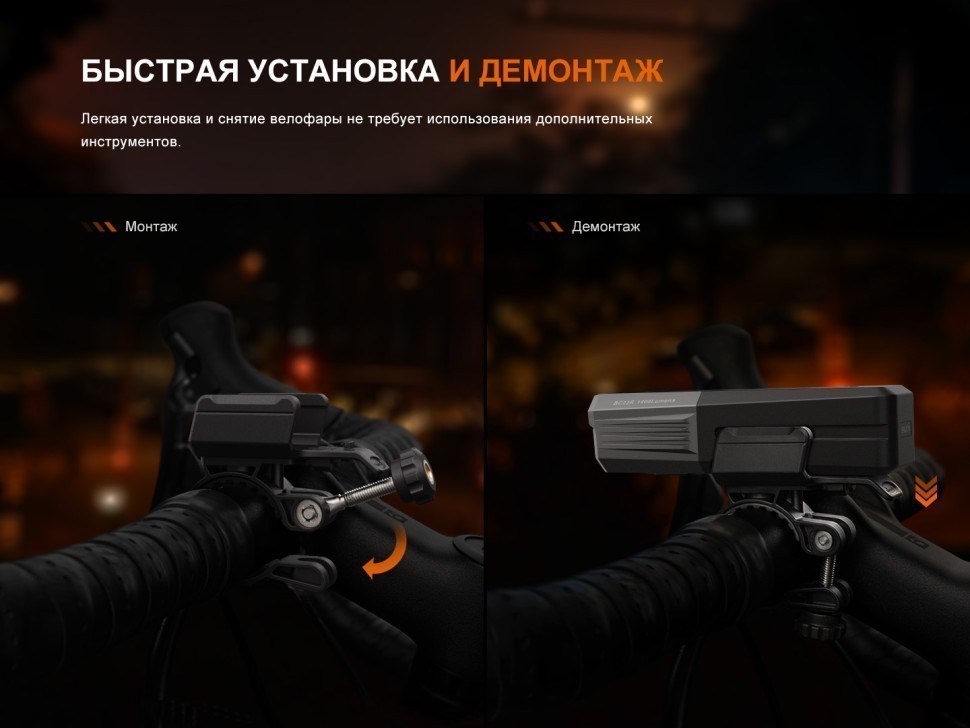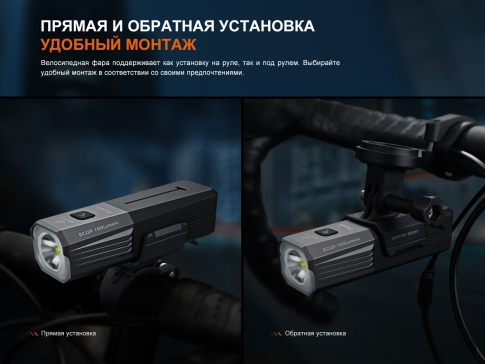 Светодиодная передняя велофара Fenix BC22R поддерживает два вида установки — прямую и обратную. Фонарь можно закрепить над рулем, либо в перевернутом положении под рулем. Простая установка крепления не требует каких-либо дополнительных инструментов. А саму фару можно легко снять с основания при необходимости.