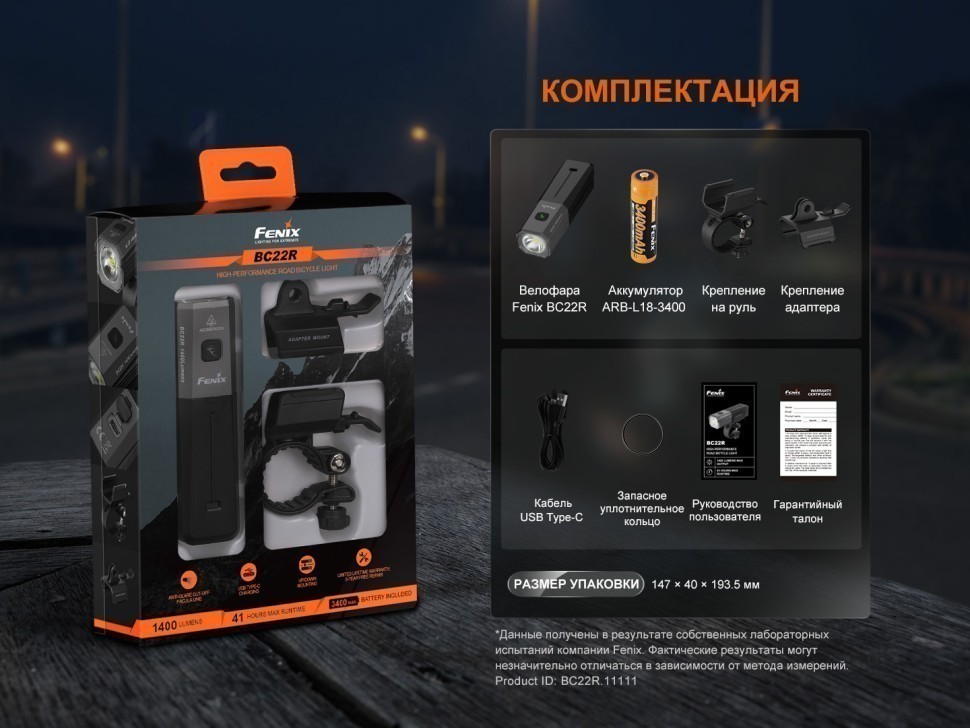 - комплектация — велофара Fenix BC22R, аккумулятор ARB-L18-3400, крепление для руля, крепление адаптера, кабель USB Type-C, запасное уплотнительное кольцо, руководство пользователя, гарантийный талон