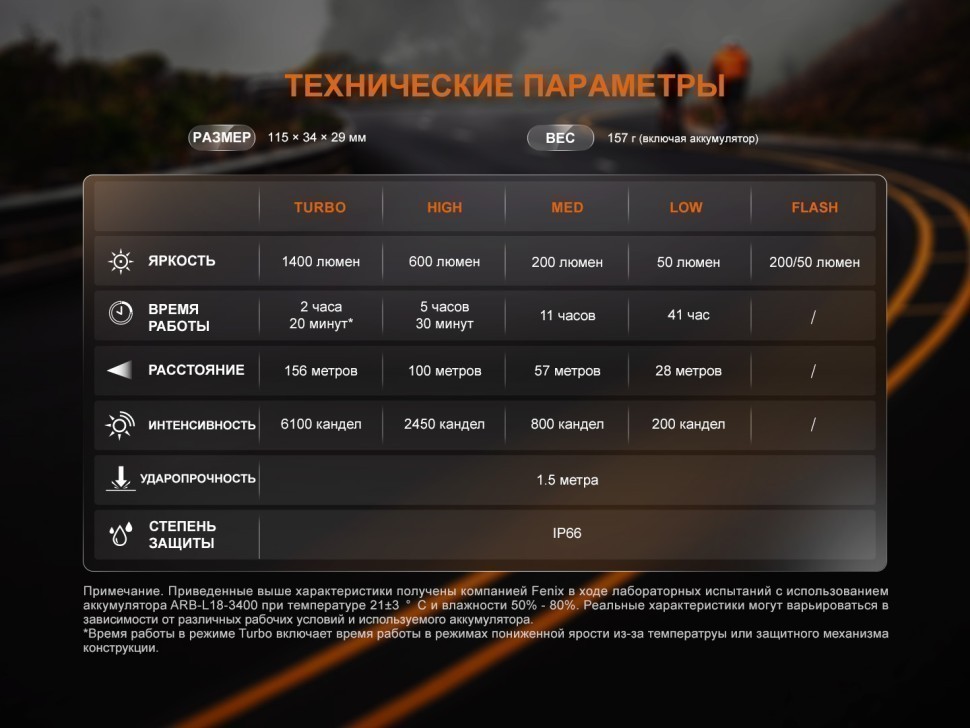 - Turbo —1400 люмен — 6100 кандел — 2 часа 20 минут — 156 метра;