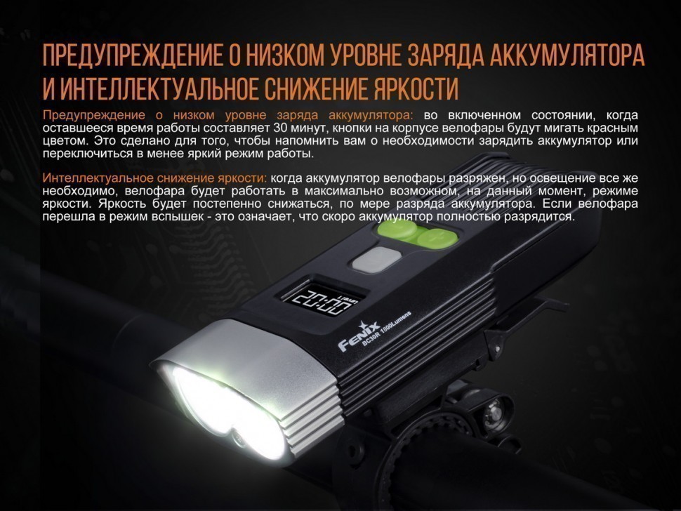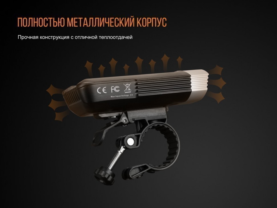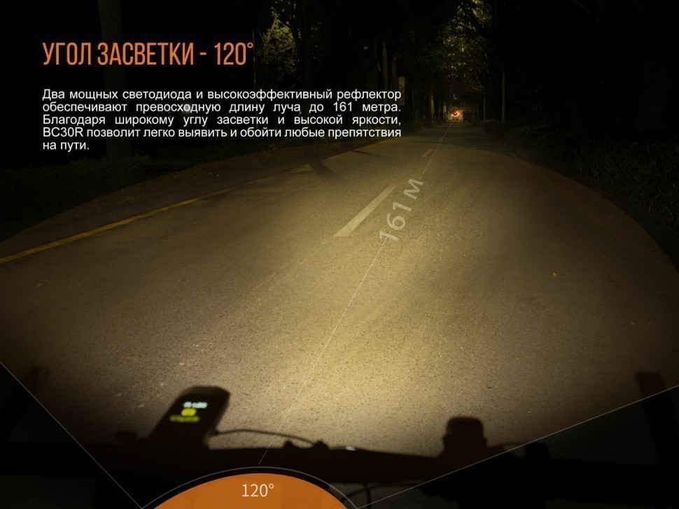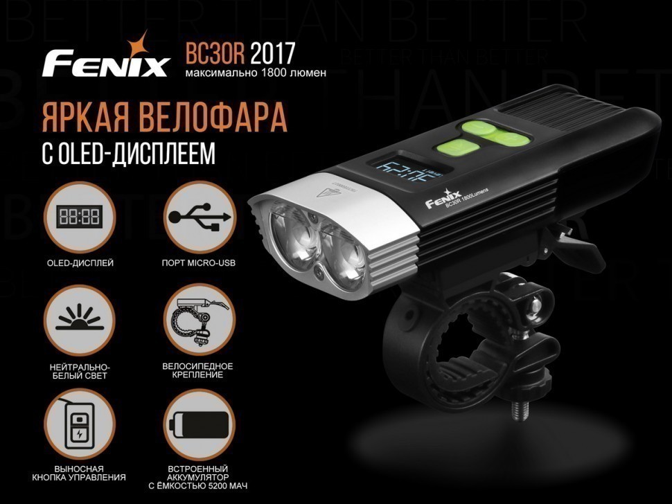 Среди высококачественных фонарей Fenix представлены и яркие, удобные в использовании велофары. В частности, одной из наиболее популярных моделей вскоре после своего появления на рынке стала модель BC30R. Это велофара, которая в состоянии предложить яркость освещения на уровне 1800 люмен. Она располагает двумя светодиодами Cree XM-L2 U2, которые дают нейтрально белый оттенок света. Яркость света от этого фонаря достигает 1800 люмен. Данная модель поддерживает 6 режимов работы с такими характеристиками: