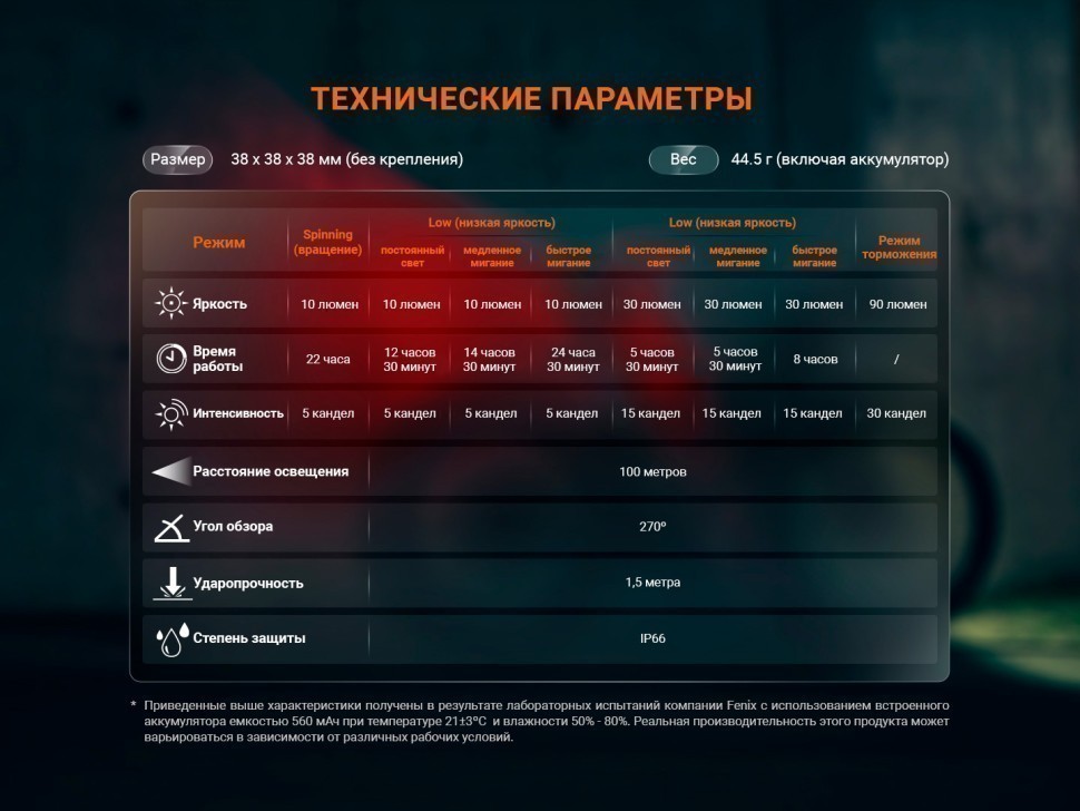 Spinning (режим вращения) — 10 люмен — 22 часа — 5 кандел;