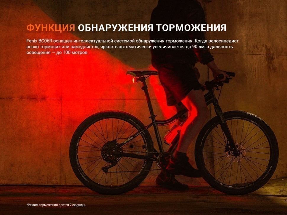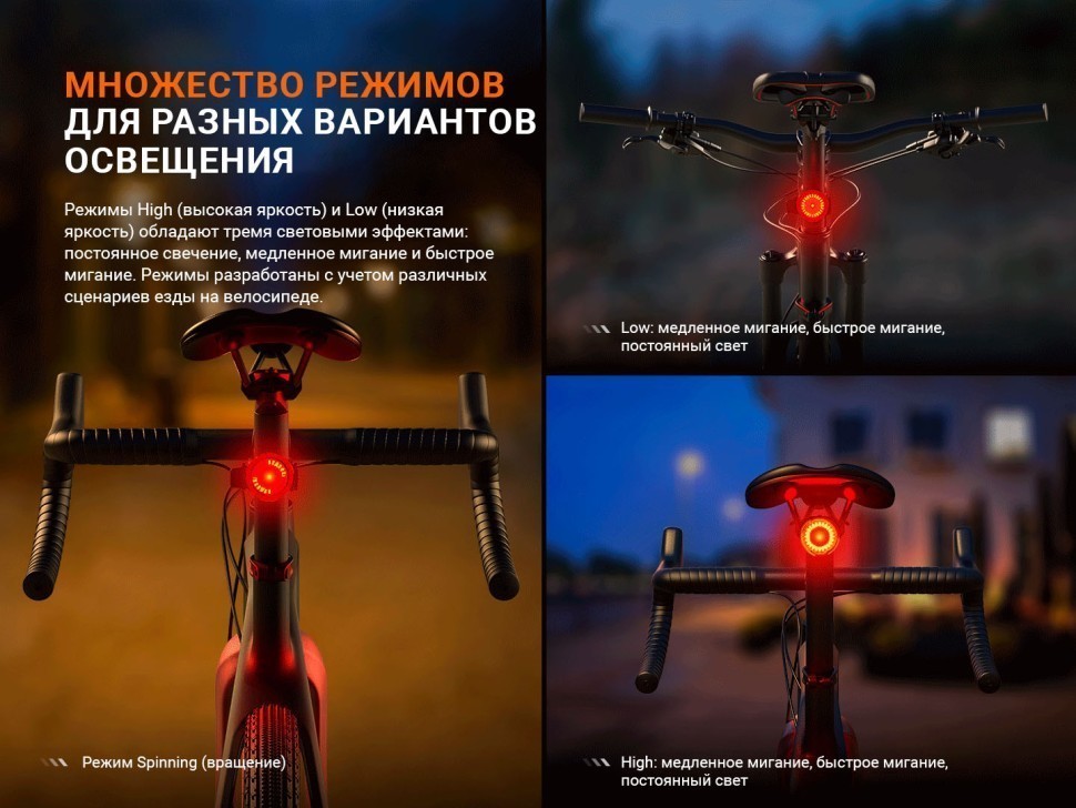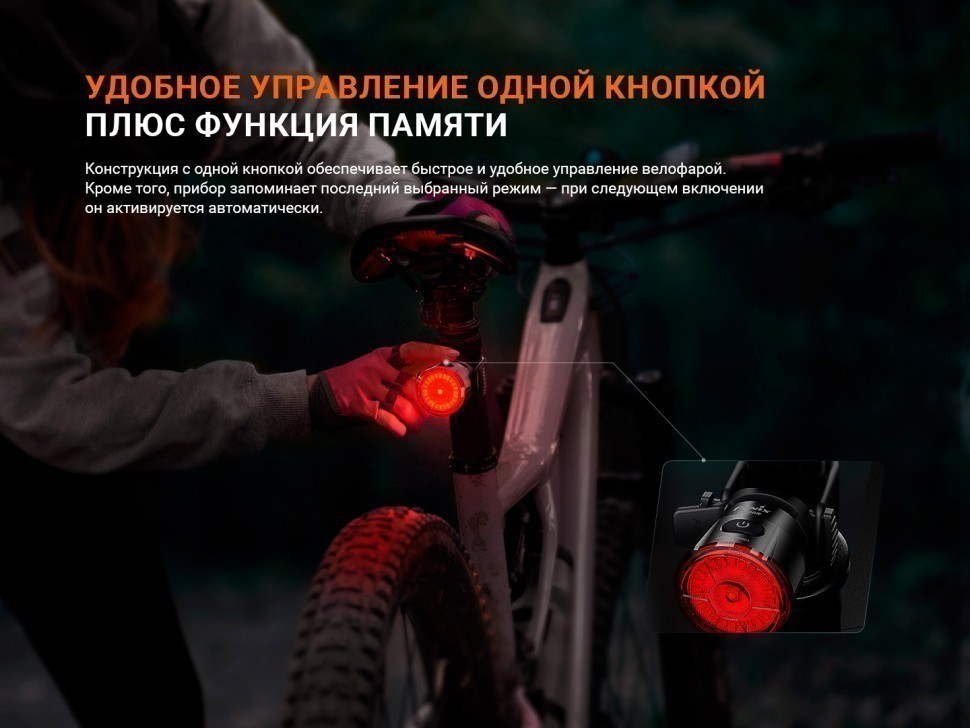 Задний велосипедный фонарь обладает функцией памяти. Он запоминает последний выбранный режим (за исключением программы интеллектуального торможения) и при следующем включении будет использовать именно его. Это значительно упрощает использование габаритного фонаря и позволяет вам не тратить время на настройку велосипедного освещения каждый раз при подготовке к поездке. Функция торможения срабатывает при быстром снижении скорости, повышая яркость до 90 люмен на несколько секунд.