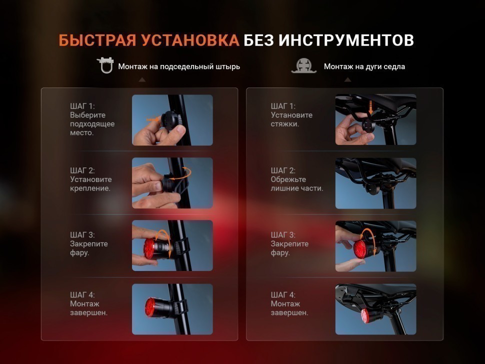 Велофара BC06R просто и удобно устанавливается на велосипед без использования дополнительных приспособлений. Ее можно закрепить двумя способами: на дуги седла и на подседельный штырь. Для установки на дуги седла расстояние между ними должно быть от 39 до 50 мм. А если вы решите использовать в качестве основания подседельный штырь, его диаметр должен составлять от 24.4 до 31.6 мм.