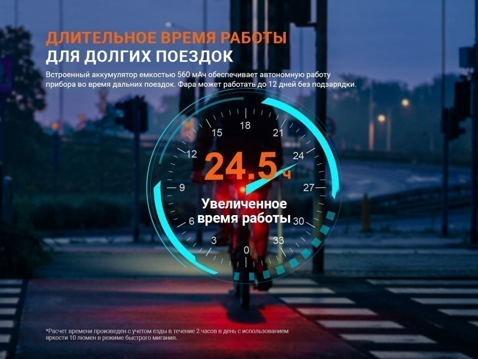 В велофонаре установлен перезаряжаемый аккумулятор емкостью 560 мАч, который обеспечивает время работы до 24.5 часов и будет незаменим при длительных поездках. При этом зарядить прибор можно всего за 2 часа с помощью кабеля USB Type-C, который идет в комплекте. Для получения информации об уровне заряда достаточно нажать на кнопку выключателя. Постоянный зеленый свет означает, что уровень заряда от 85 до 100%, мигающий зеленый — от 50 до 85%, красный — от 25 до 50%, мигающий красный — от 1 до 25%.