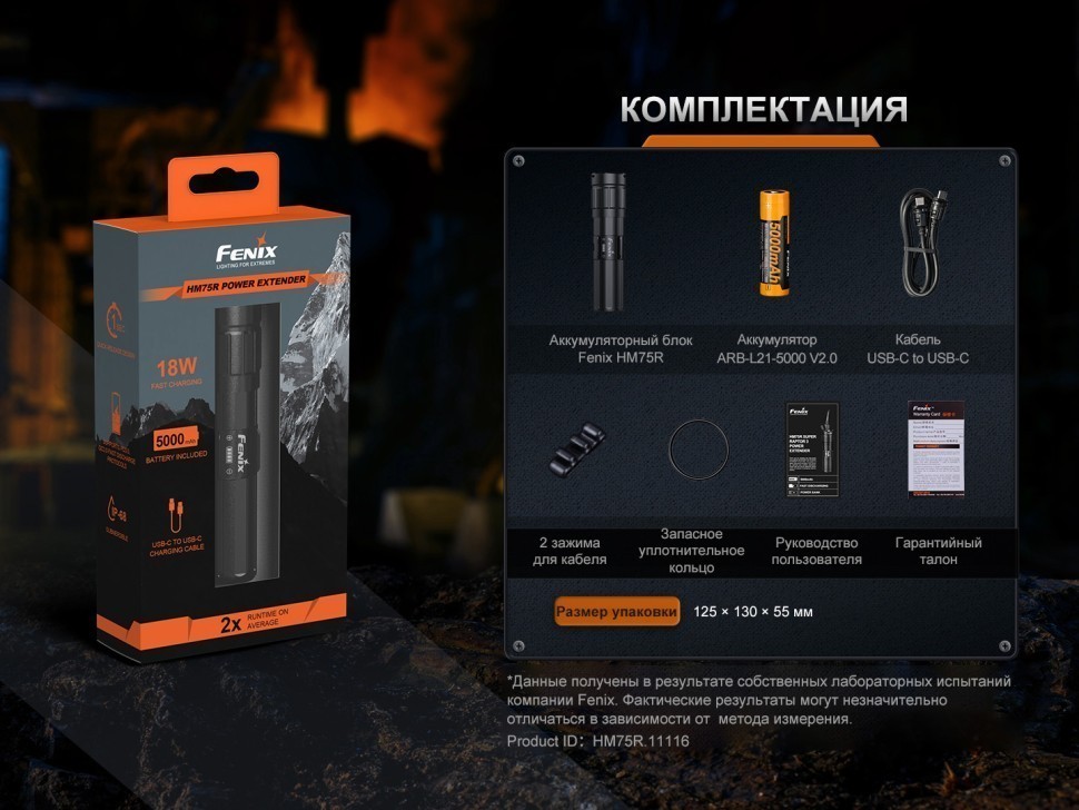 Внешний аккумуляторный блок Fenix ARB-LP21 разработан для налобного фонаря Fenix HM75R, но также может использоваться с другими моделями Fenix благодаря встроенной функции Powerbank. Устройство значительно увеличивает общее время автономной работы фонарей. Например, при работе с HM75R блок увеличивает время свечения фонаря в режиме минимальной яркости с 100 до 234 часов. Также Fenix ARB-LP21 служит универсальным внешним источником питания для зарядки различных электронных гаджетов — от смартфонов и планшетов до GPS-навигаторов и беспроводных наушников. Через разъем USB-C можно подключать любые совместимые приборы.