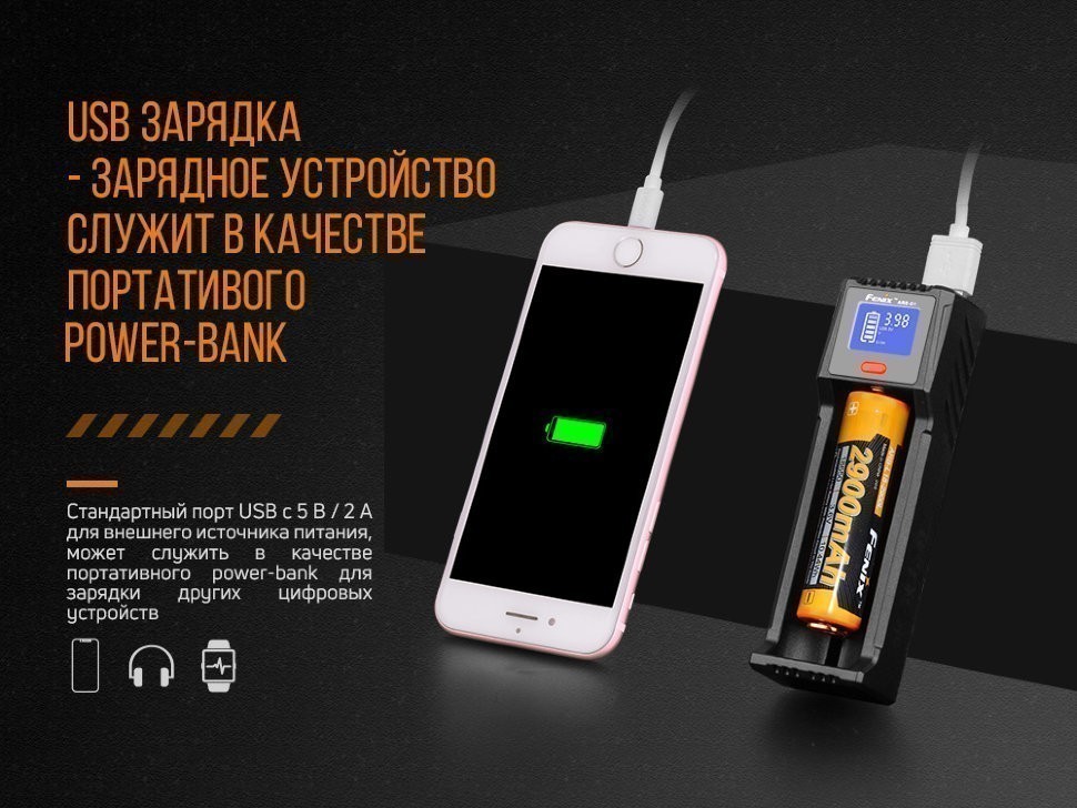 Устройство Fenix ARE-D1 также можно использовать для разрядки аккумуляторов, если их энергией необходимо подзарядить гаджеты. В этом случае, к Fenix ARE-D1 нужно подключить провод USB, который затем подключить к нужному прибору. В это время функция зарядки будет заблокирована. Максимальный ток разрядки составляет 2А. Эта функция доступна только для работы с литий-ионными аккумуляторами.