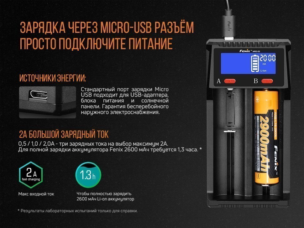 В режиме зарядки литий-ионных аккумуляторов, Fenix ARE-D2 отключается после заряда на 100%. Если же в слоты были установлены Ni-MH либо Ni-Cd элементы питания, Fenix ARE-D2 продолжит зарядку малым током, чтобы выполнить ее как можно эффективнее.